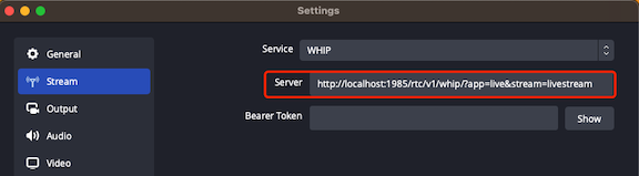 http://localhost:1985/rtc/v1/whip/?app=live&stream=livestream。 - 单击OK以保存设置。
