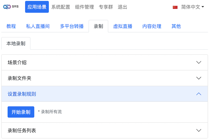 发布直播流后,您可以使用Oryx开始录制。为此,请打开Scenarios > Record > Setup Record Rules部分, 然后点击Start Record按钮。