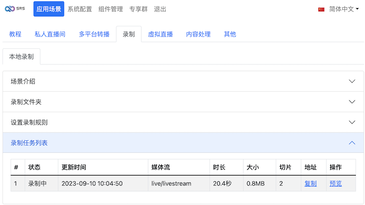 当您想要停止录制时,请在Setup Record Rules部分点击Stop Record按钮。等待几秒钟,让录制停止。如果直播流不再发布, Oryx将在几分钟后(例如5分钟)自动停止录制任务。
