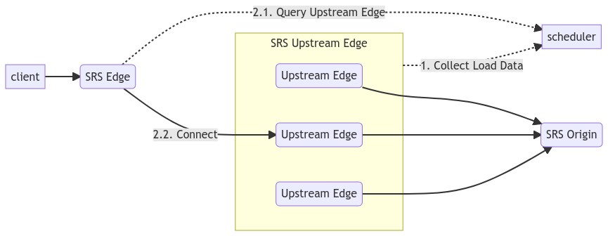 SRS的Edge边缘集群中,在寻找上游Edge服务器时,使用的也是简单的Round Robin方式,这是假设流的路数和服务时间比较均衡,在开源中是比较合适的策略。本质上,这就是上游Edge服务器的负载均衡策略,相当于是解决了总是回源到一台服务器的过载问题。如下图所示: