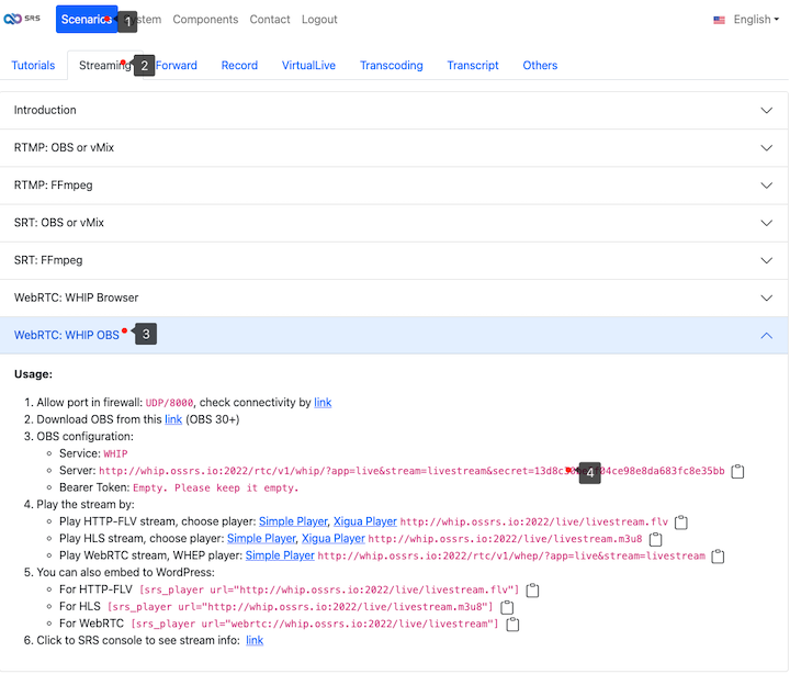 打开 Oryx,选择场景 > 推拉直播流 > WebRTC:WHIP OBS,并操作步骤,获取一个WHIP的推流地址。