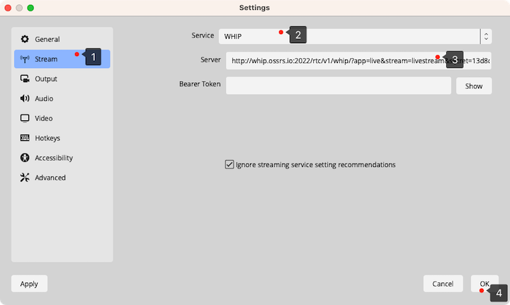 接下来,启动 OBS 并选择设置 > 流。从服务下拉菜单中选择WHIP,并将 WHIP URL 设置到服务器字段中。