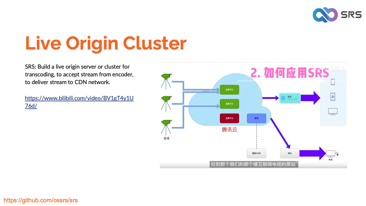 您还可以从Origin服务器拉取流,转码、DVR 或将它们转发到其他服务器,甚至将它们交付给 CDN 或使用 SRS 创建 CDN。