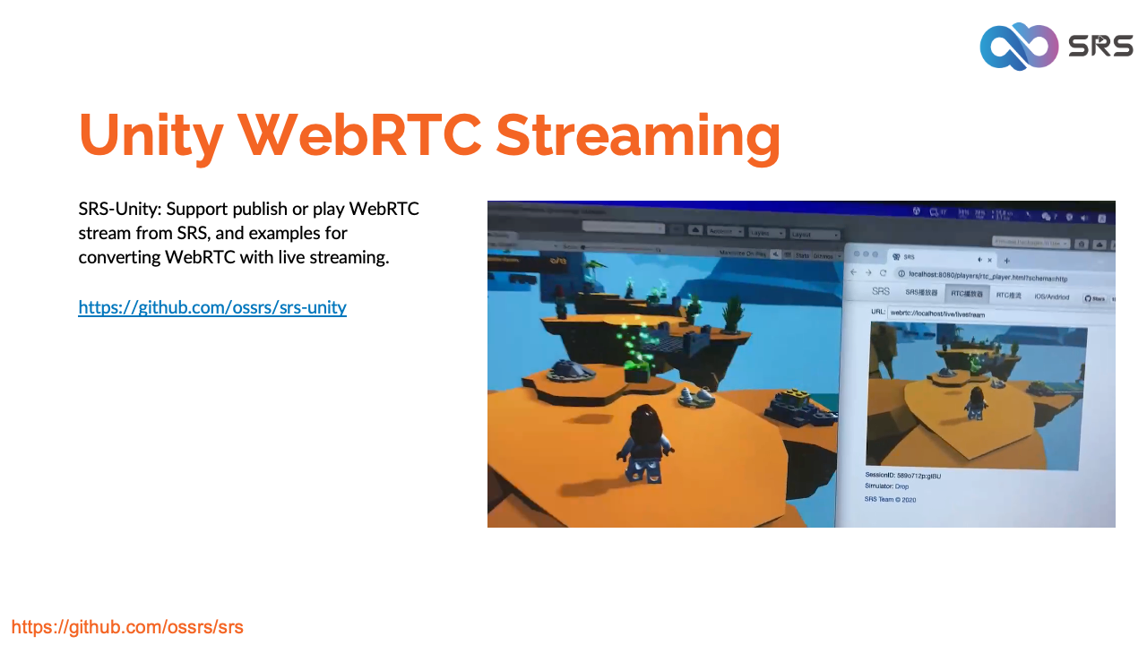 您可以将 Unity 摄像头画面发送到 SRS,并在浏览器中播放流,从 SRS 检索流并在 Unity 游戏中显示,或者使用 WebRTC 使多个 Unity 游戏互动。