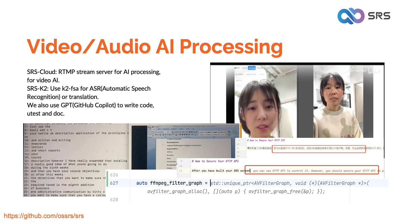 SRS在AI领域的视频和音频处理方面也很有用。从SRS接收流,然后用AI模型处理它们,比如使用deepfake进行人脸替换。