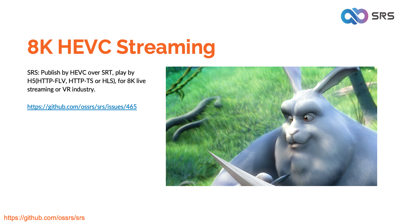 HEVC是业界广泛采用的编解码器,通过OBS支持RTMP和SRT。将HEVC流通过OBS发送到SRS,然后使用H5播放器、mpegjs.js、VLC或ffplay播放流。