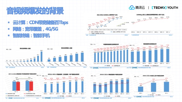 音视频的爆发性增长,是由于云计算、基础网络和智能终端的快速发展和完善。基础网络这十年是飞速发展,4G的广泛应用,宽带基本实现了全国犄角旮旯的覆盖。智能终端特别是智能手机的普及,中国进入移动互联网时代。信息的传递 方式逐步可以使用更直观的音视频。