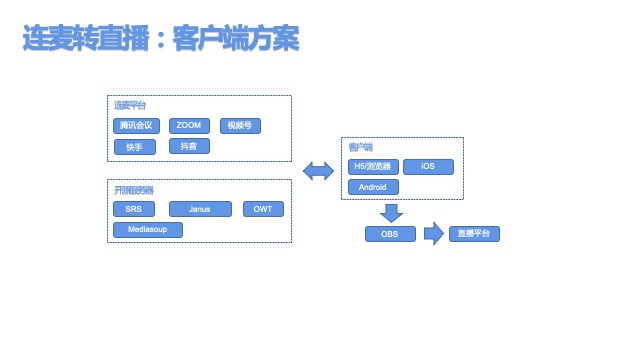 - 客户端混流:使用OBS抓取连麦的画面和声音,OBS天然就具备混流和布局的能力,然后推直播就可以。