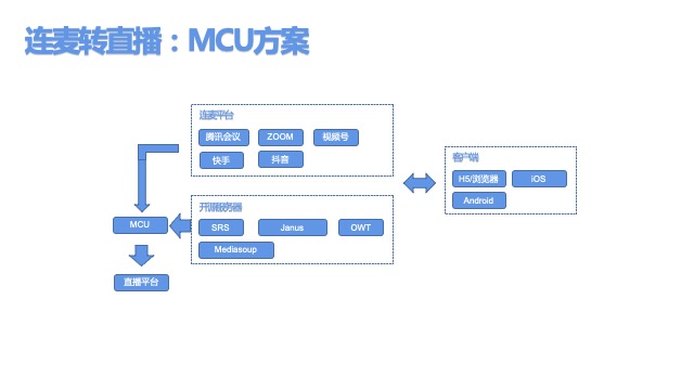 - 服务器混流:连麦的平台将连麦的流混流后转直播流,或者将WebRTC流转RTMP流后混流。