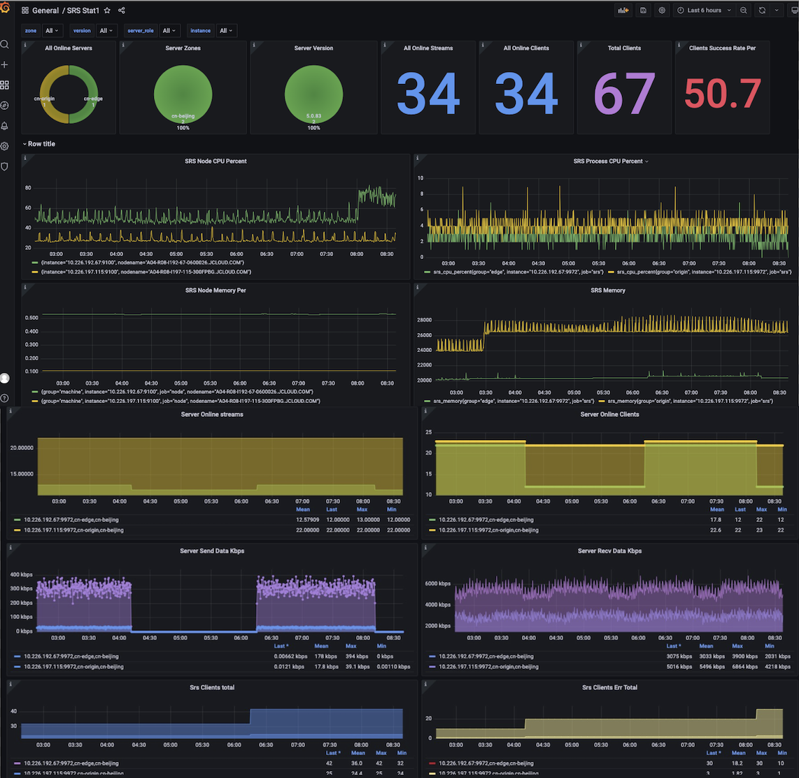 我们还提供了更加完整的仪表盘,可以在srs-grafana中看到,如下图所示: